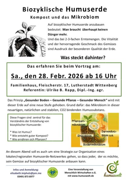 Am Samstag, den 28. Febr. 2026 ab 16 Uhr wird Ulrike Rapp in der Lutherstadt Wittenberg im „Familienhaus“, Fleischerstraße 17 einen Vortrag zum Thema „Biozyklische Humuserde“ halten.